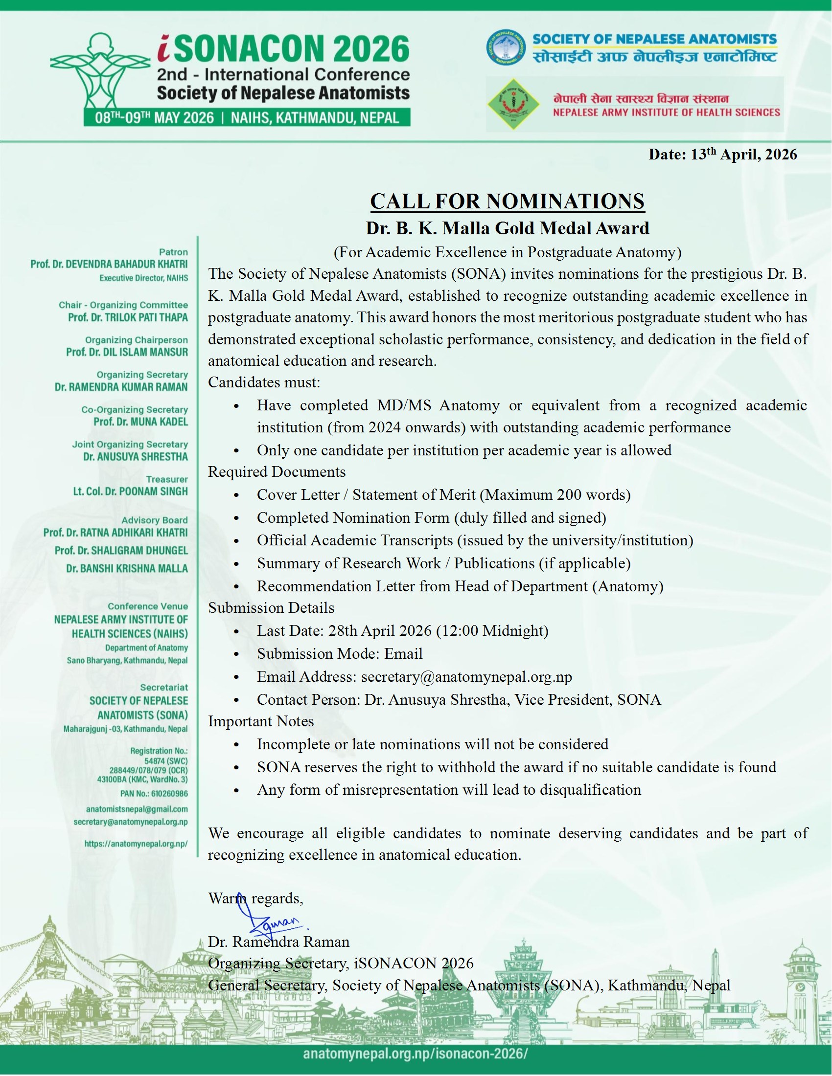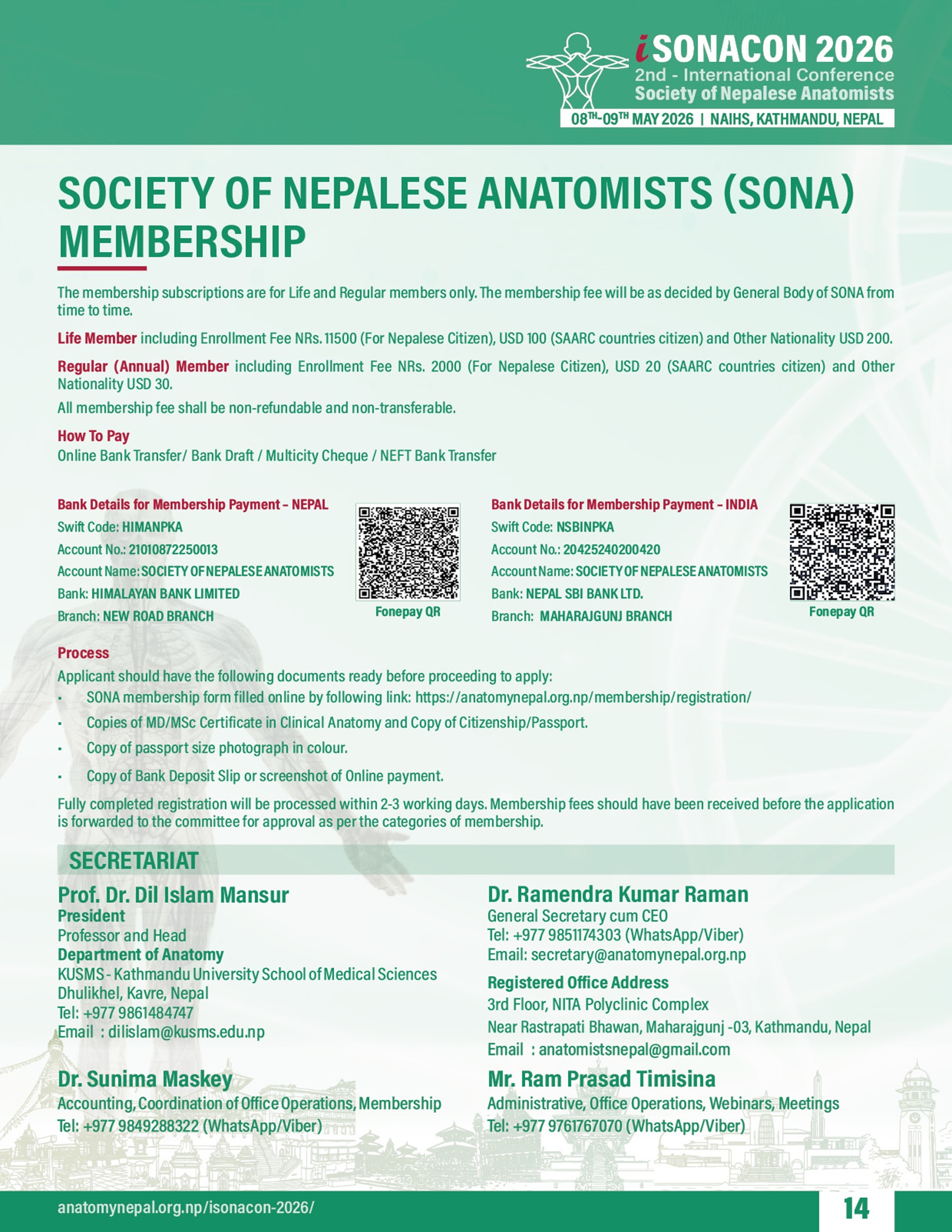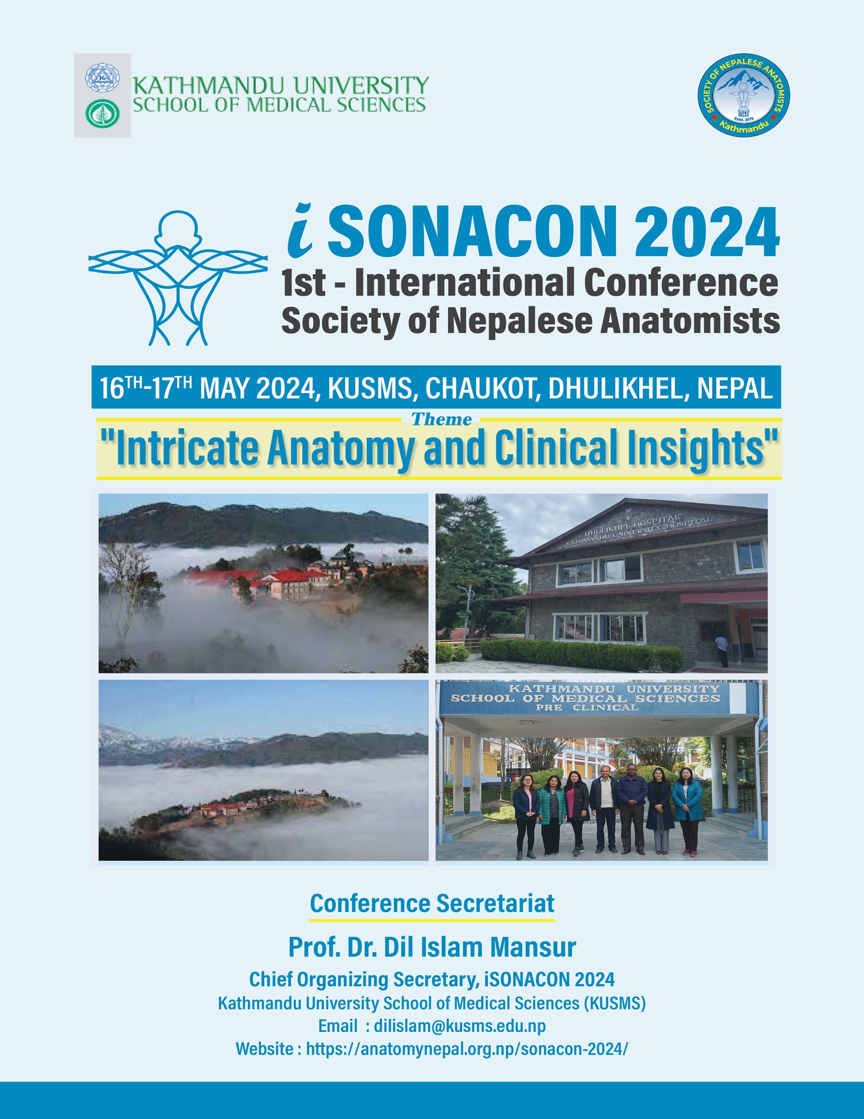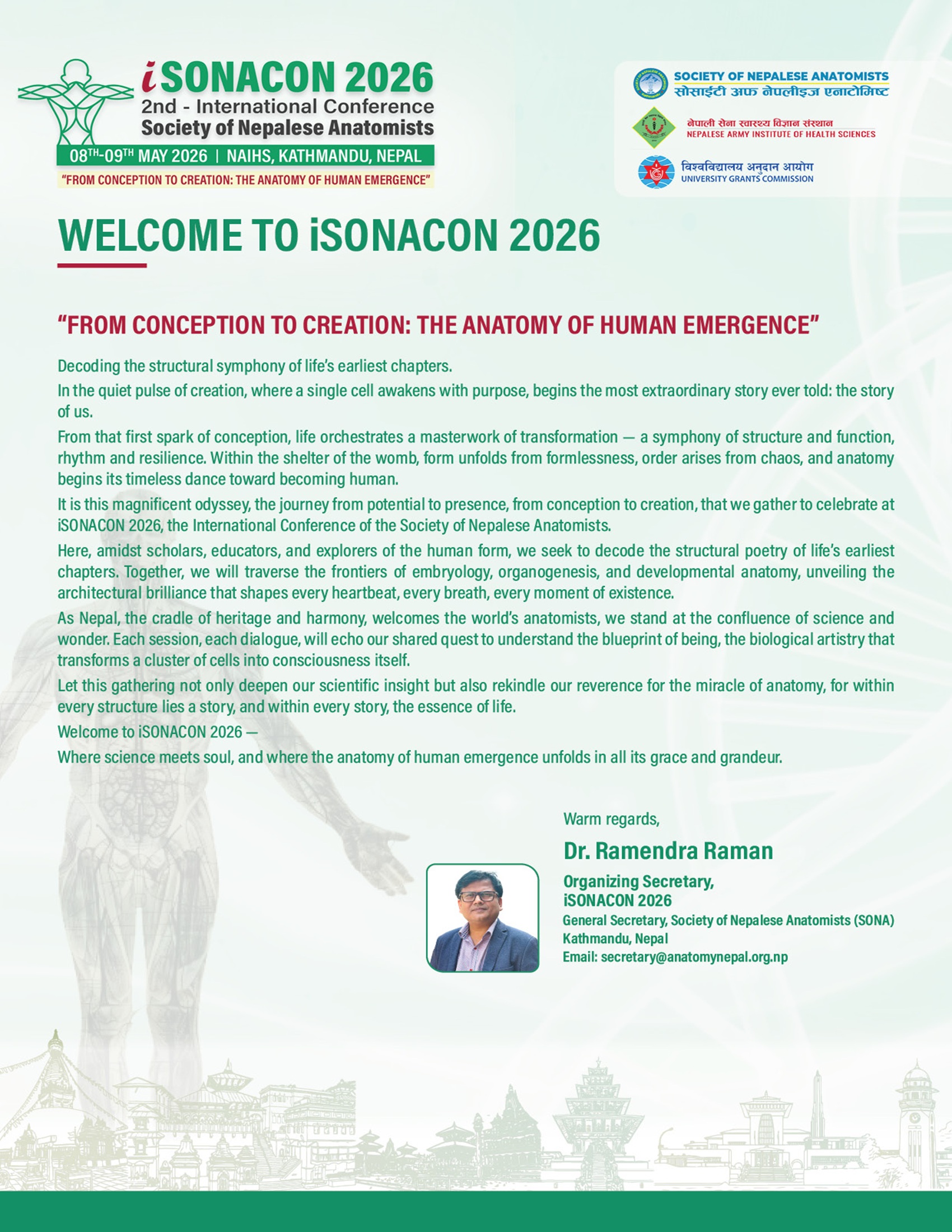 iSONACON 2026, the 2nd International Conference of the Society of Nepalese Anatomists to be held in Nepalese Army Institute of Health Sciences (NAIHS), Kathmandu, Nepal on 8th–9th May 2026 bringing together leading anatomists, medical educators, researchers, and healthcare professionals from across the globe.